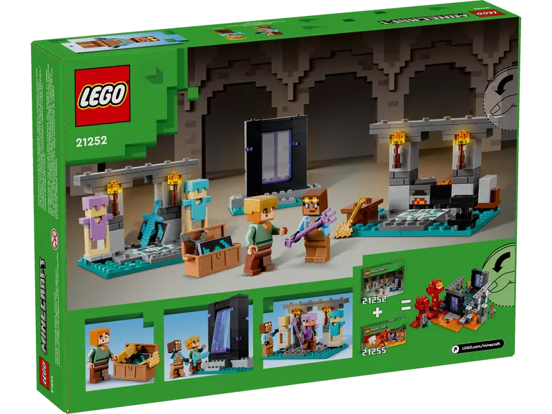 Gracze w Minecrafta® w wieku od siedmiu lat będą zachwyceni bronią i funkcjami znanymi z Minecrafta w zestawie Zbrojownia (21252). Ten zestaw konstrukcyjny LEGO® Minecraft to świetny pomysł na prezent dla dzieci, zapewniający graczom kreatywne przygody w świecie Minecrafta. Ten zestaw dla dzieci zawiera dwie znane figurki: Alex, bohaterkę gry z tarczą i diamentowym mieczem, oraz pracowitego płatnerza. Do zbadania są trzy miejsca: miejsce pracy z kowadłem, piecem, kamieniem szlifierskim i kotłem wypełnionym lawą, sala wystawowa ze zbroją, skrzynią zawierającą złoty topór, zaczarowany trójząb, netherytowy miecz, tarczę i inne akcesoria z Minecrafta, oraz portal do Netheru z wahadłowymi drzwiami. Ta zabawka stanowi także zestaw dodatkowy umożliwiający odgrywanie ról, który można połączyć z innymi zestawami LEGO Minecraft, w szczególności z Zasadzką w portalu do Netheru (21255), sprzedawaną osobno.