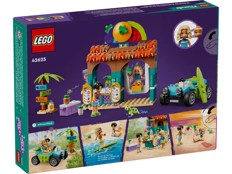 Zainspiruj sześciolatki i starsze dzieci do kreatywnej zabawy dzięki zestawowi LEGO® Friends Plażowa budka z koktajlami (42625). Zestaw zawiera budkę z koktajlami do zbudowania, łazik plażowy, a także minilaleczki LEGO Friends Novy i Niko.